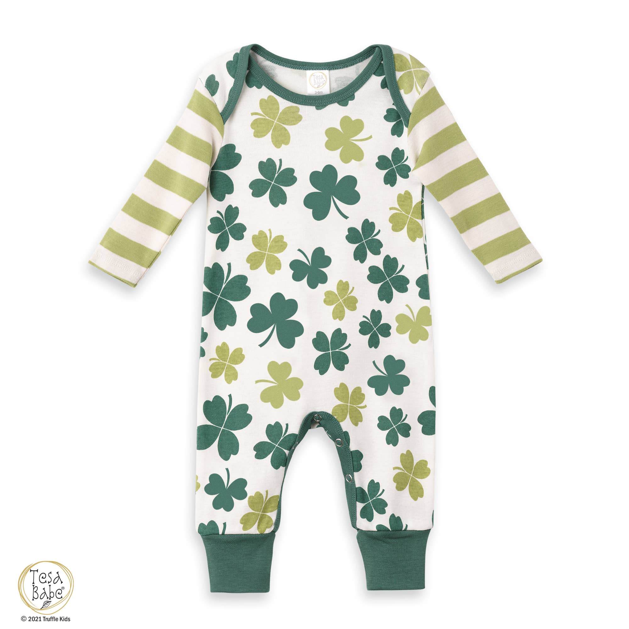 Baby romper with shamrock & clover print & green stripe sleeves. Soft and stretchy 100% cotton rib material is oh-so-gentle against baby’s skin. Romper has an envelope neck and snaps underneath for changing ease. Perfect for St. Patrick’s Day.