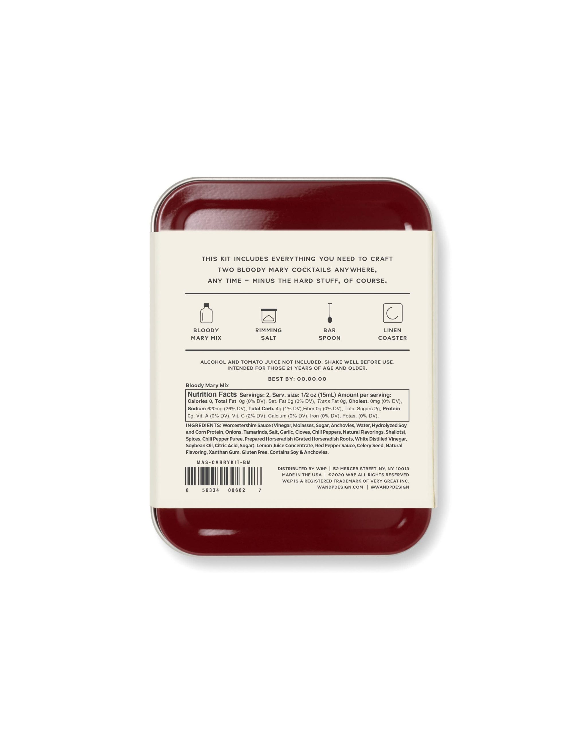 Bloody Mary kit includes: tin (dimensions 3.125″ x 4.25″ x 1″), recipe card, bar spoon, 1/2 oz jigger, Bloody Mary mix, rimming salt, linen coaster
