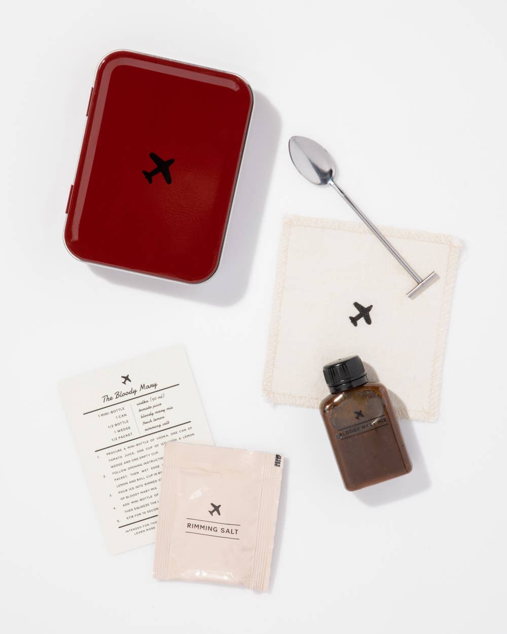 This kit includes the tools to craft two Bloody Mary cocktails mid-flight: small-batch Bloody Mary mix, pack of rimming salt, a travel-size bar spoon, a recipe card and a linen coaster. Just add the hard stuff and stir.