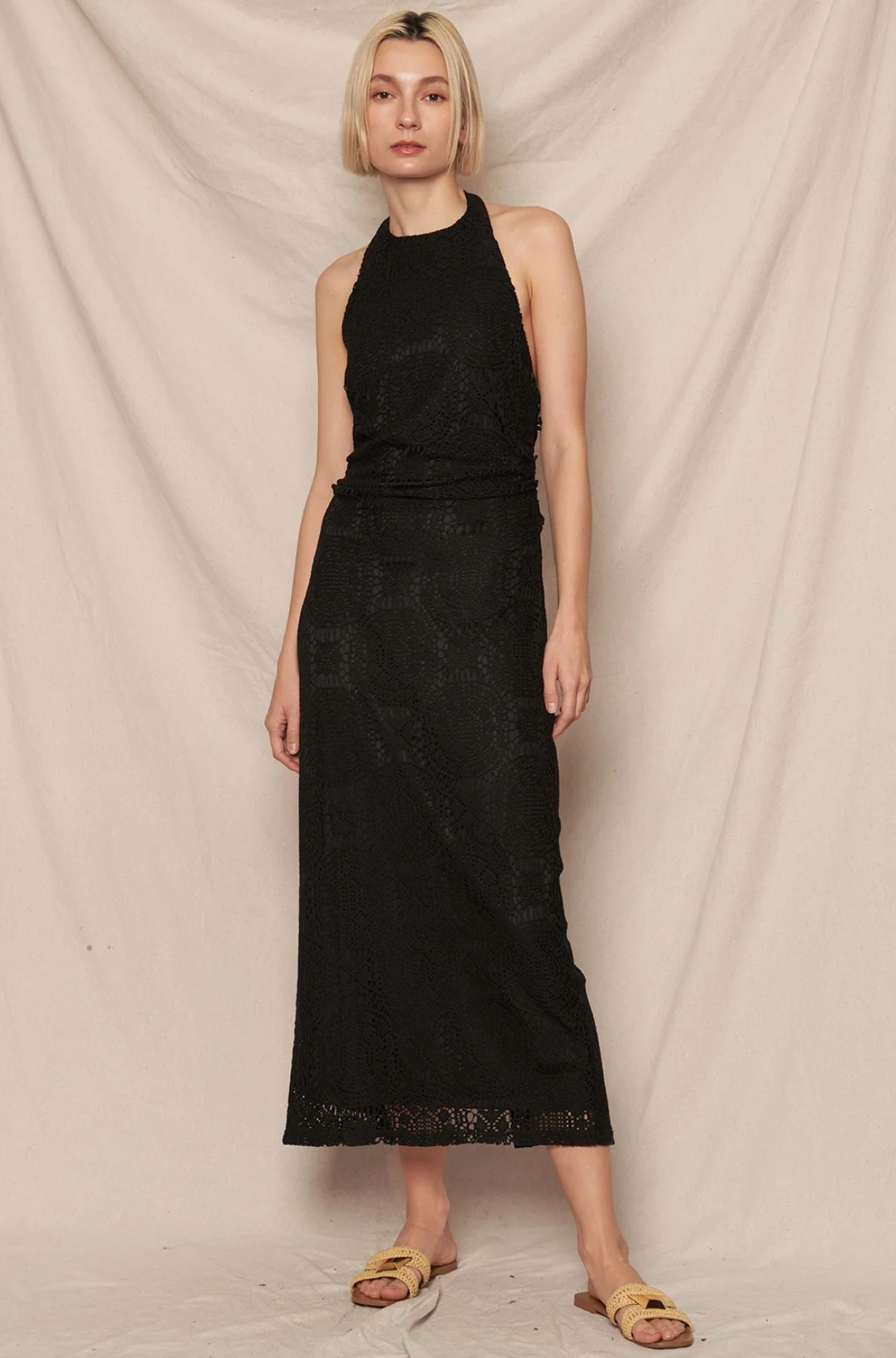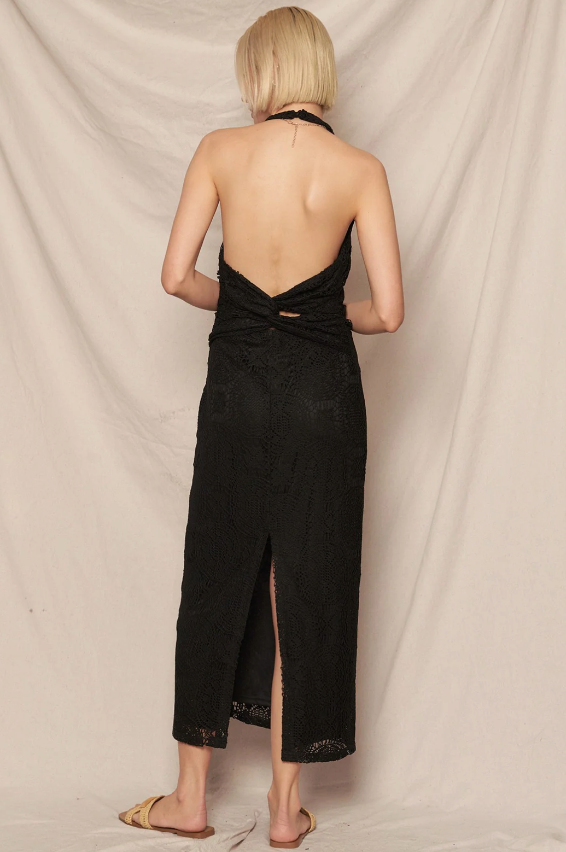 Elevate your evening style with our Black Lace Open-Back Midi. This dress exudes refined glamour with its intricate lace overlay, graceful midi length, and dramatic open-back detail. The halter neckline adds a touch of allure, making it an ideal choice for memorable moments. Fits true to size.Â
