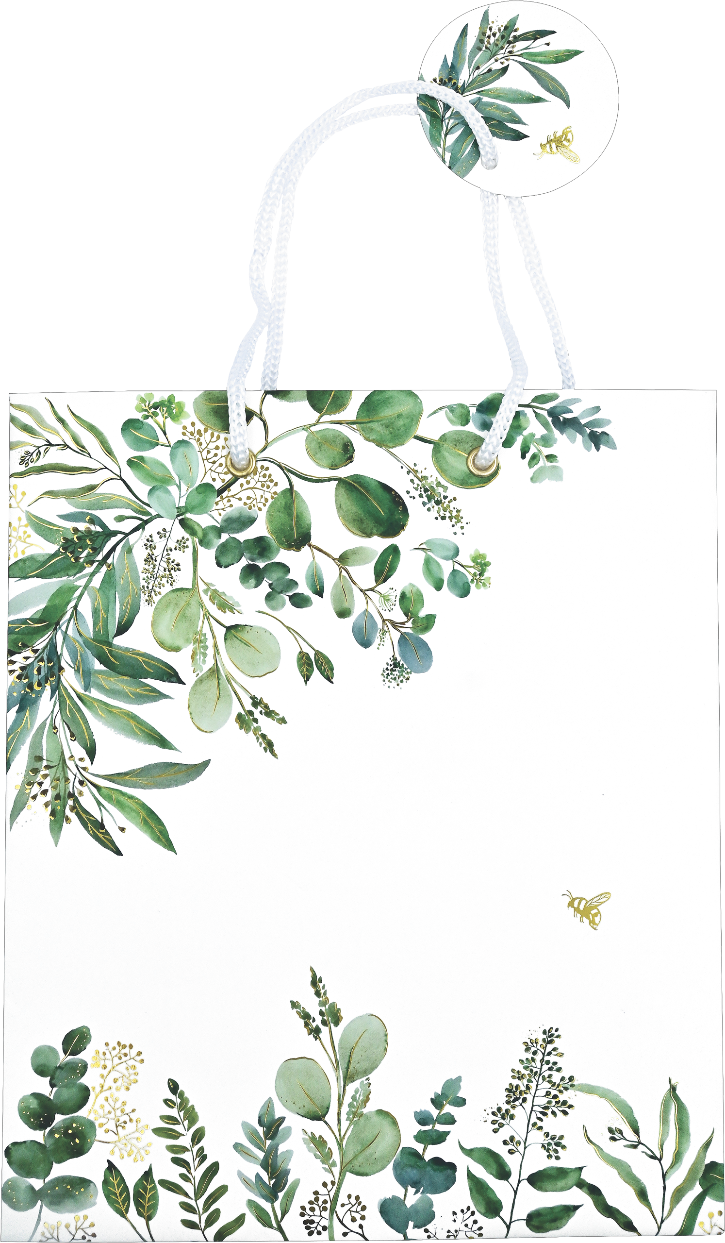 Make an impression with this beautiful gift bag! A fresh take on botanical inspiration, our Eucalyptus design combines delicate watercolor greenery, accented with a honeybee in flight and embellished with touches of gold foil. The finishing touches: Gold metal grommets, white cord handles, and an attached matching circular ”To/From” card. Substantially constructed gift bag is side-pleated and has a reinforced cuff and a flat bottom with a cardboard insert. Suitable for a variety of occasions. Gift bag measures 8-1/2” wide x 10” high by 3-7/8” deep when open. Matches Peter Pauper Press’s other Eucalyptus gifts and stationery.