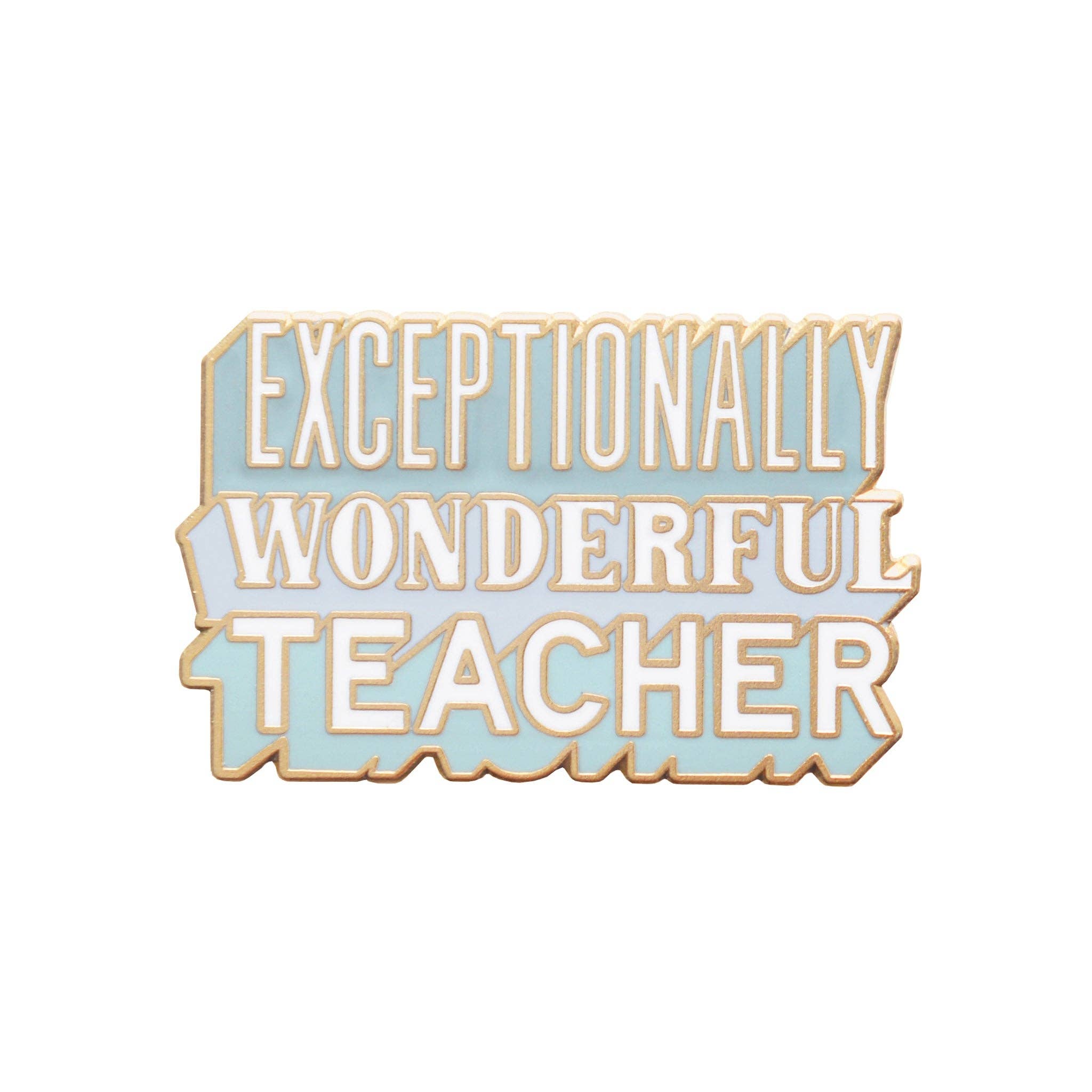 A bright and colourful pin, featuring our ‘Exceptionally Wonderful Teacher’ design. Made from matt gold toned metal with tones of teal and blue hard enamels, complete with a rubber clasp on the reverse.Â