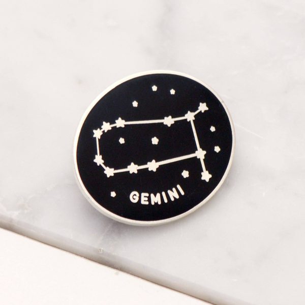 This little enamel pin badge features our Gemini constellation illustration. Made from black hard enamel and matt silver colour metal with a rubber clasp.