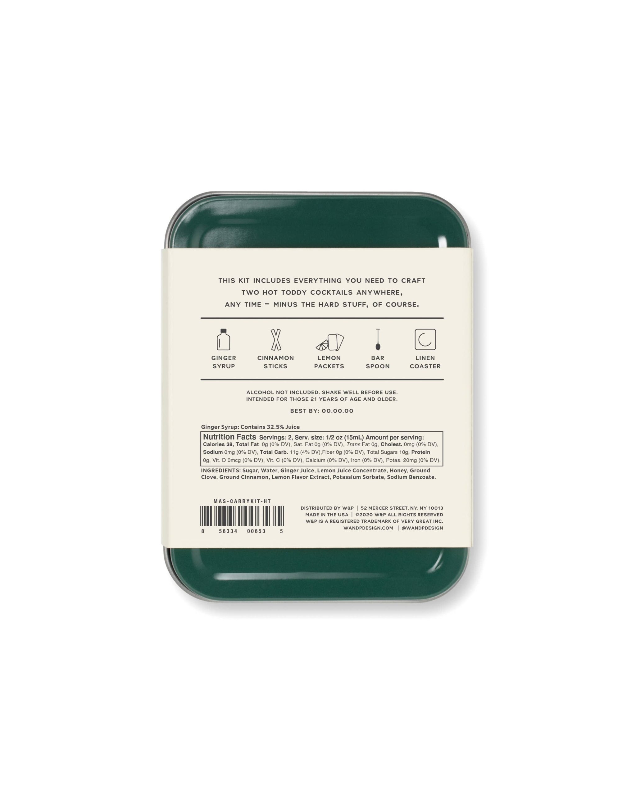 Hot Toddy kit includes: tin (dimensions 3.125″ x 4.25″ x 1″), recipe card, bar spoon, 1/2 oz jigger, small batch ginger syrup, cinnamon sticks, linen coaster