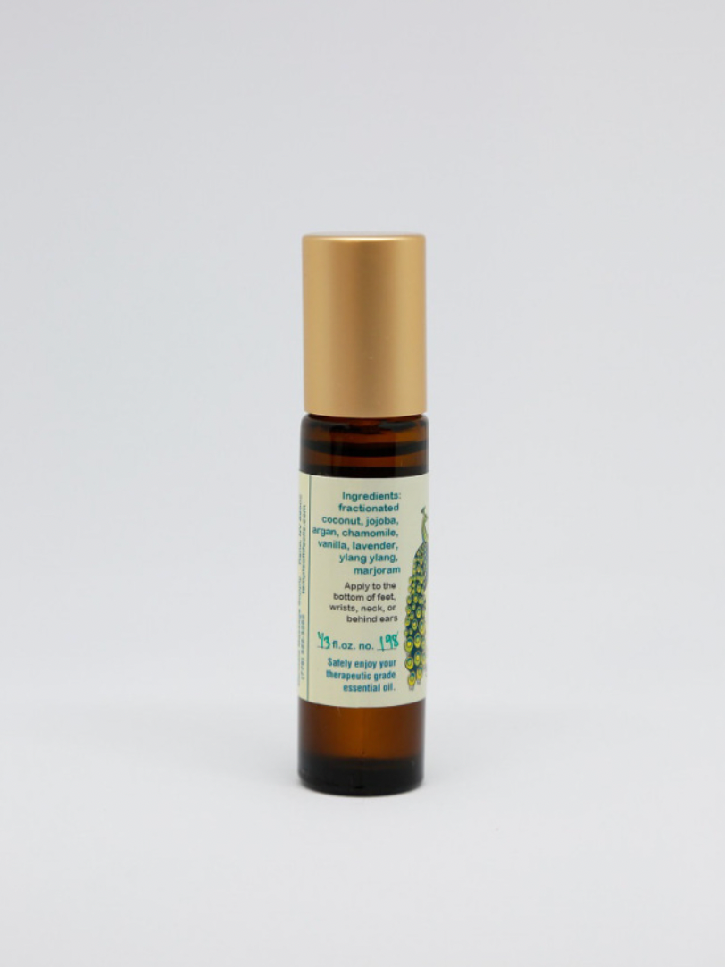 Blended in a silky base of Fractionated Coconut, Jojoba, & Argan with Roman Chamomile, Rose Geranium, Ylang Ylang, Lavender, & Vanilla therapeutic essential oils.