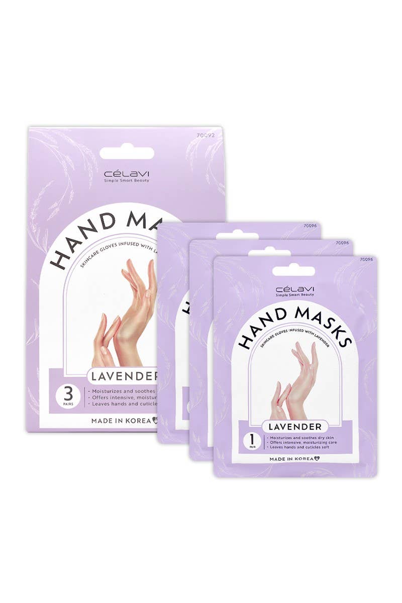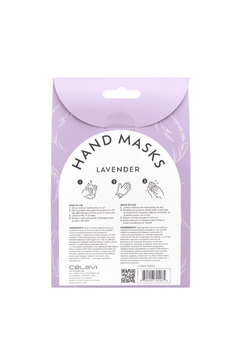 Celavi 70092 1 Pair Lavender Hand Masks. Skincare gloves infused with lavender to help moisturize and sooth dry skin. Offers intensive and moisturizing care. Leaves hands feeling soft and hydrated. Made in Korea. 3 pair in 1 set.