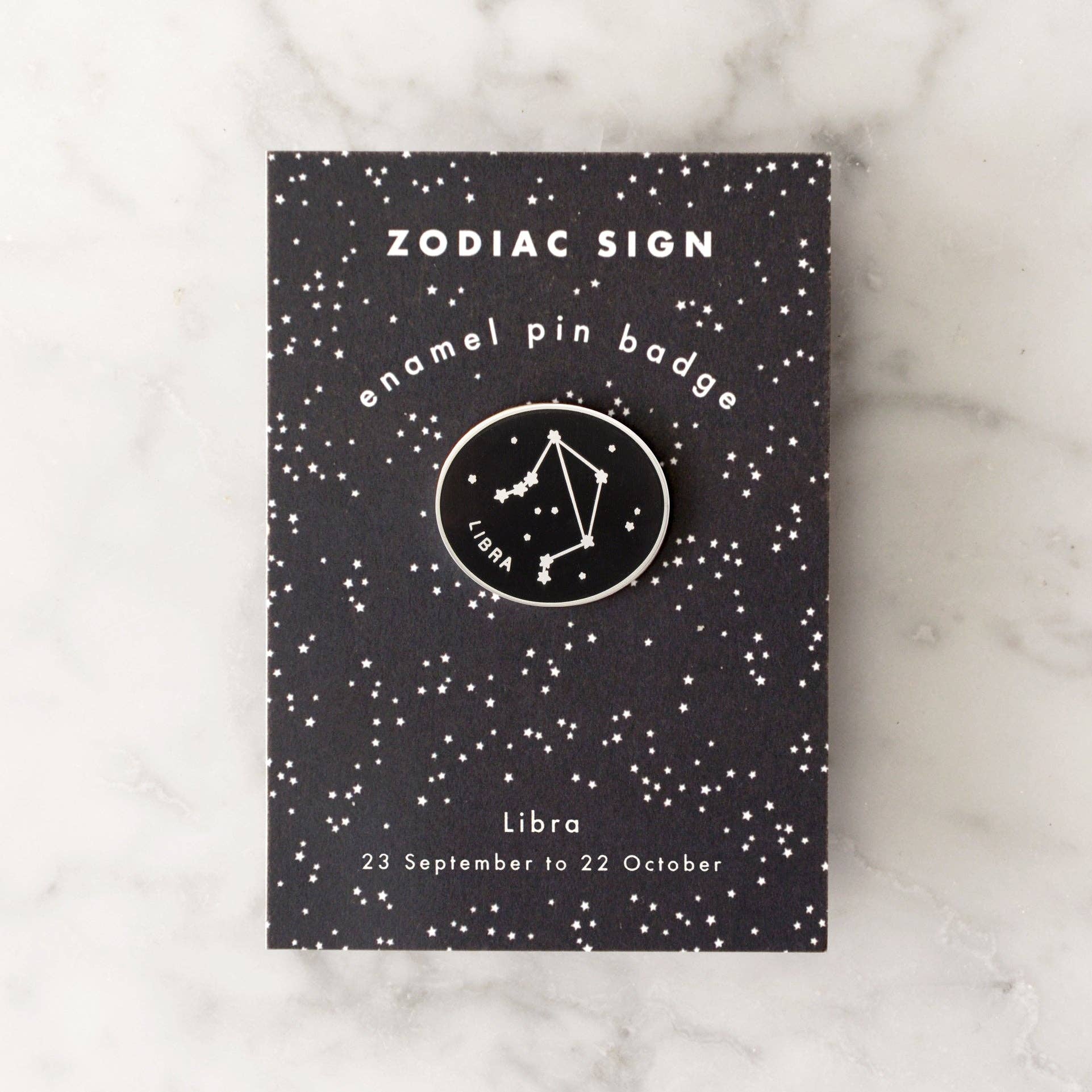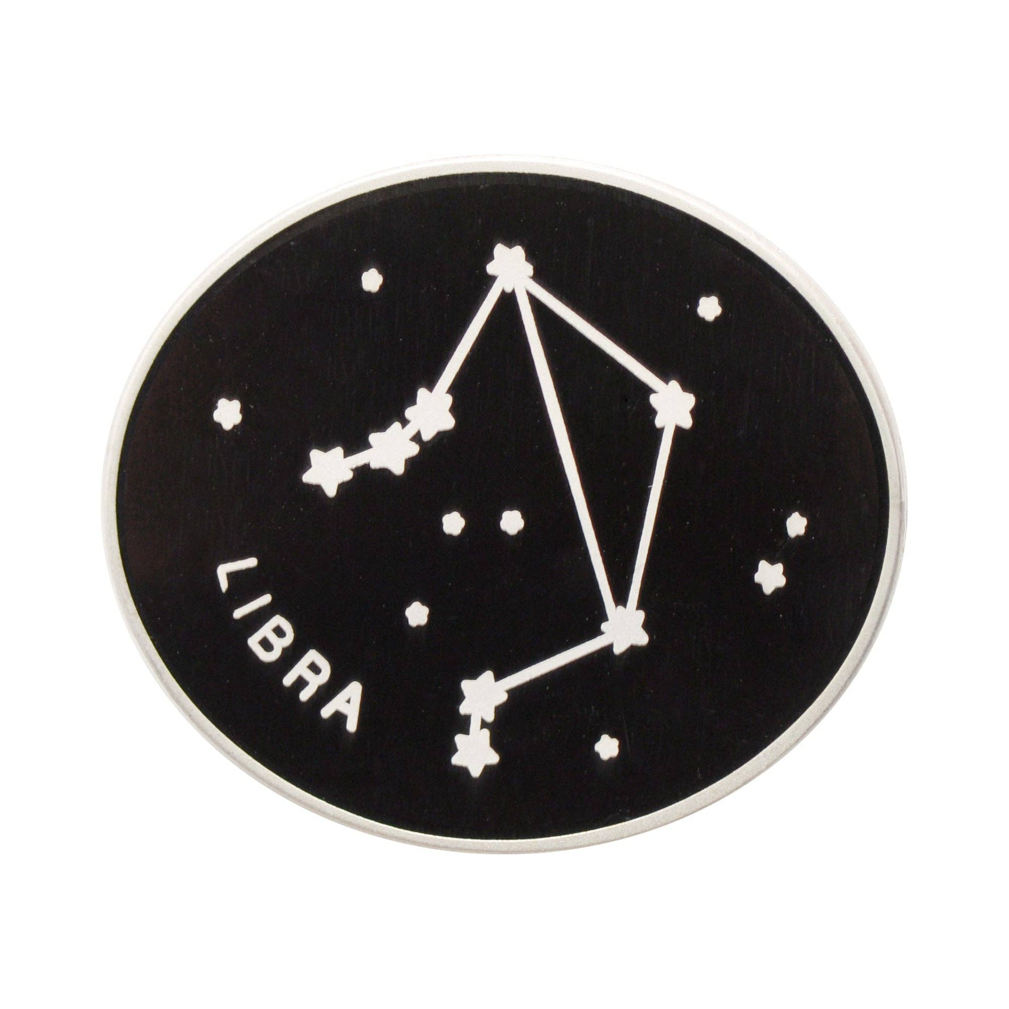 This little enamel pin badge features our Libra constellation illustration. Made from black hard enamel and matt silver colour metal with a rubber clasp.