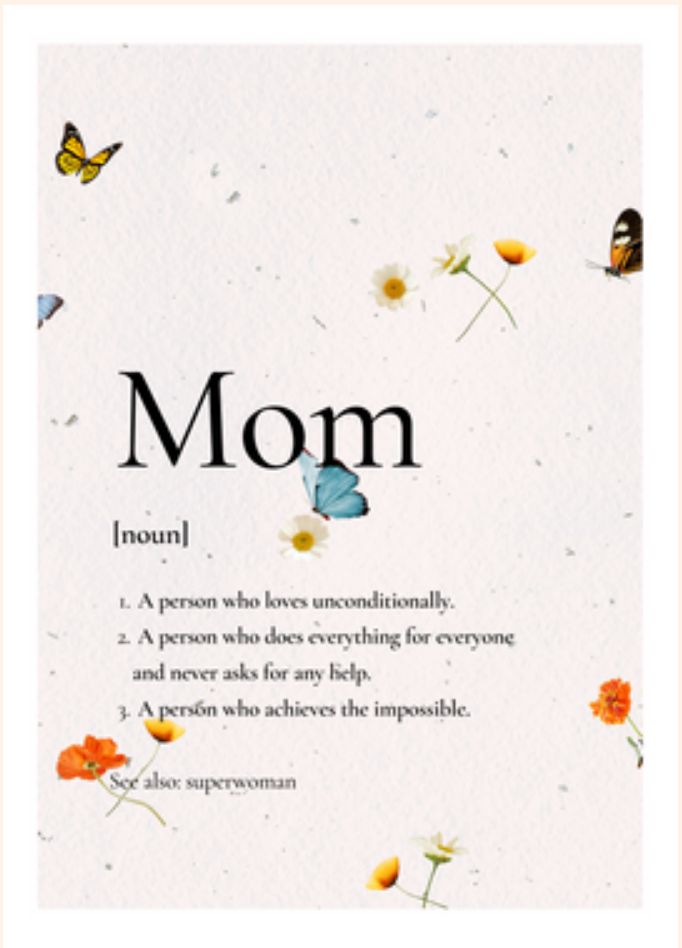 Celebrate the meaning of “Mom” with this heartfelt greeting card featuring a beautiful definition that captures the love, strength, and warmth only a mom can give. Perfect for Mother’s Day, birthdays, or any special occasion, this card is a meaningful way to honor the incredible woman who’s always there with love and support.