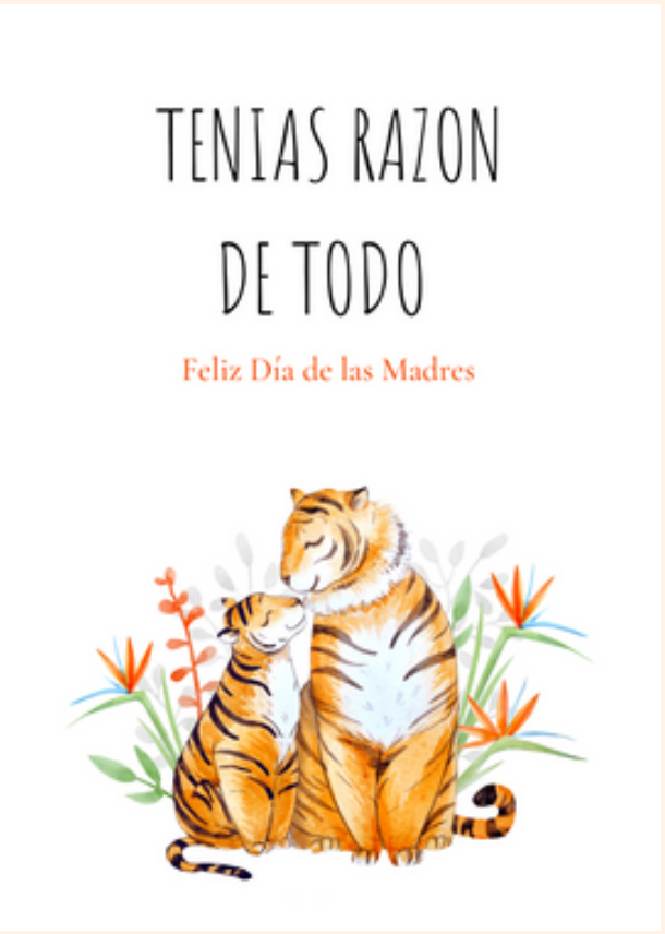 Celebrate Mom with this adorable greeting card featuring a loving mom and baby tiger duo. The card reads “Tenías razón de todo” — a sweet reminder that Mom was right about everything — with “Feliz Día de las Madres” below. Perfect for showing appreciation and sharing a heartfelt smile this Mother’s Day!